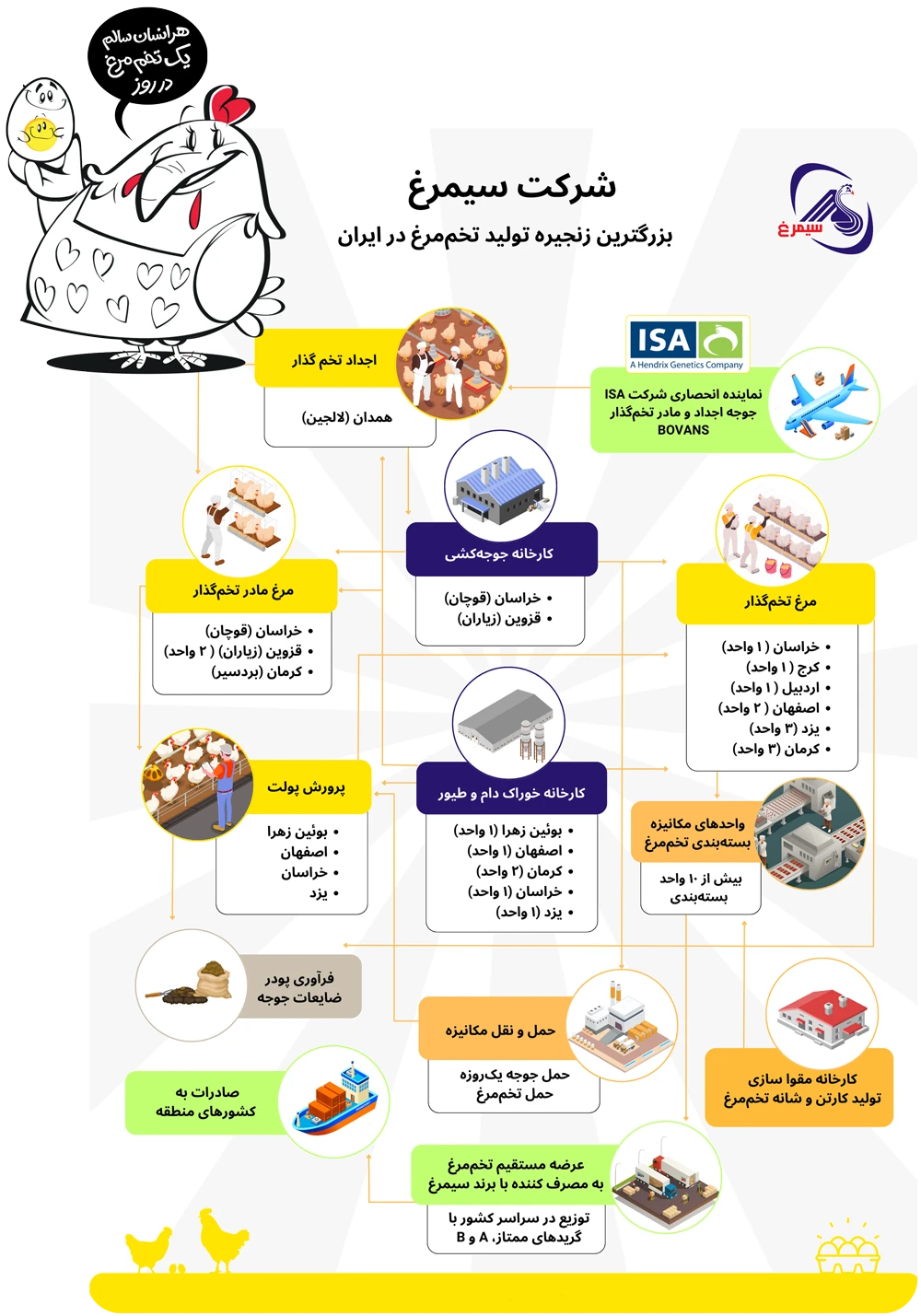 شرکت سیمرغ بزرگترین مجتمع طیور در خاورمیانه با قدمتی بیش از نیم قرن، دارای اولین و بزرگترین زنجیره تولید تخم مرغ در ایران میباشد. مجموعه سیمرغ مفتخر است اعلام نماید به عنوان نماینده انحصاری شرکت ایزا (نژاد مرغ اجداد و مـرغ مـادر تـخمگذار بونـز سفید) در ایـران و منطقه فعالیـت مـیکند.